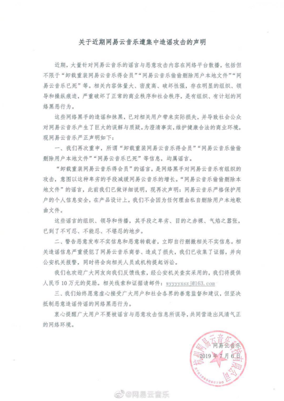 7月2日,网易云音乐在苹果App Store下架。随后,网络有传言称“卸载重装网易云音乐得会员”“网易云音乐偷偷删除用户本地文件”“网易云音乐已死”。对此,7月6日网易云音乐官方微博发布“关于近期网易云音乐遭集中造谣攻击的声明 ”,对于上述恶意造谣,平台已搜集证据并向公安机关报案。