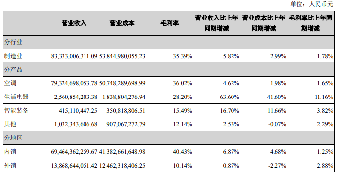 然而,据2019年半年报显示,格力电器来自空调产品的收入占据了绝大部分营收,其他业务的营收占比不足总营收的5%。