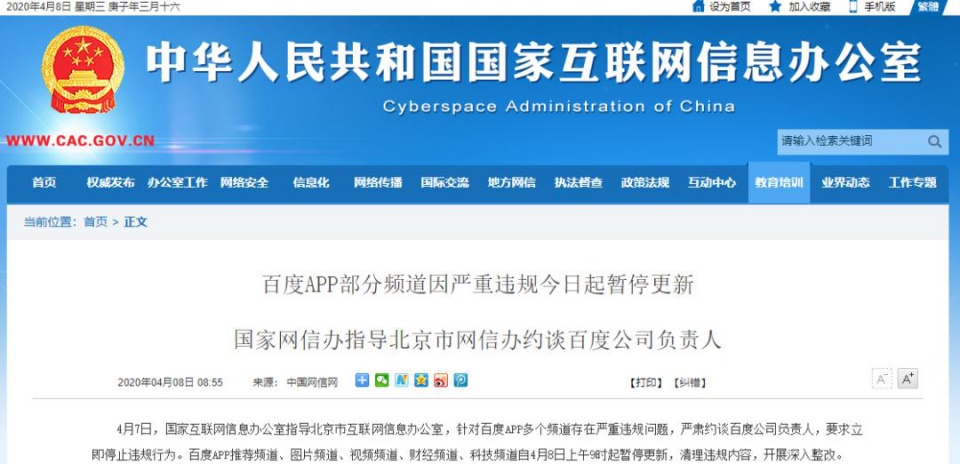 原创内容 疑似整改完成 百度APP停更频道恢复正常 2020-04-25 10:16:09 分享 炣燃科技4月25日讯(江丞华)4月24日,有网友发现,百度APP日前暂停更新、整改的部分频道疑似已完成整改工作。截至《炣燃科技》发稿时,上述暂停更新的百度APP部分频道的页面内容已恢复正常,整改期间显示的“认真整改,为用户提供更好服务”字样已消失。公开资料显示,因部分频道存在违规问题,国家互联网信息办公室于4月7日约谈百度APP,次日,百度App推荐频道、图片频道、视频频道、财经频道、科技频道共5个频到开始暂停更新、清理违规内容并整改。