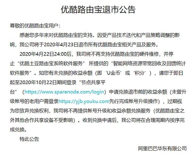 优酷路由宝退市公告显示,从2020年4月22日24时开始,该公司将不再支持优酷路由宝的硬件维修,并停止“优酷土豆路由宝系统软件服务”所提供的“智能网络资源宽带回收及回馈统计软件服务”。如用户有未兑换的收益余额(U金币或积分),请于即日起至10月22日期间登录节点共享平台申请兑换。