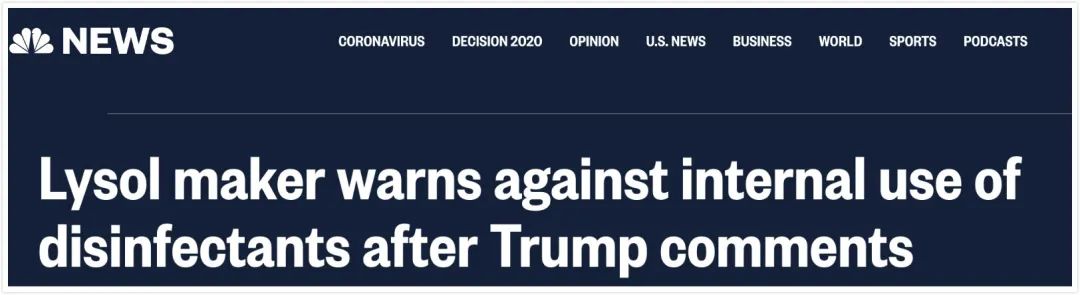 在美国总统特朗普建议考虑向感染新冠病毒的患者“注射”消毒剂,以此来抑制病毒后,Lysol和滴露的生产商英国利洁时公司(Reckitt Benckiser)立即发出警告:任何情况下,我们的消毒产品都不能进入体内。