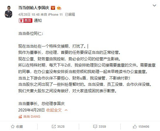 4月28日,针对李国庆发布的“人事公告”,当当网对外回复称,人事公告无效,因为在李国庆抢走公章后,该公司已将公章挂失,李国庆在使用挂失的公章演闹剧。