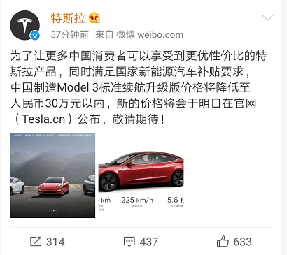 4月30日,特斯拉官网微博发布公告称,为了满足国家新能源汽车补贴要求,中国制造Model 3标准续航升级版价格将降低至30万元以内,新的价格将于明日在官网公布。