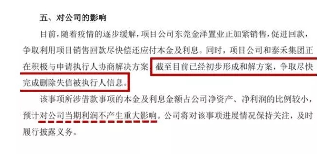 泰禾集团在26号的公告中对此回复称,目前随着疫情的逐步缓解,项目公司东莞金泽置业正加紧销售,促进回款,争取利用项目销售回款尽快偿还应付本金及利息。同时,项目公司和泰禾集团正在积极与申请执行人协商解决方案,截至目前已经初步形成和解方案,争取尽快完成删除失信被执行人信息。
