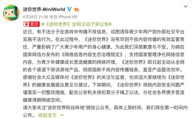 需要强调的是,网络游戏杜绝涉黄信息,是起码的底线,不能不曝光就不自查,更不能是应付式整改。相比导致未成年人沉迷,网络游戏充斥涉黄信息,性质要严重得多,伤害也要严重得多。《迷你世界》认识到问题的严重性,主动将游戏下架整改,本身值得肯定,但希望不是危机公关动作,公众不看广告只看实效。