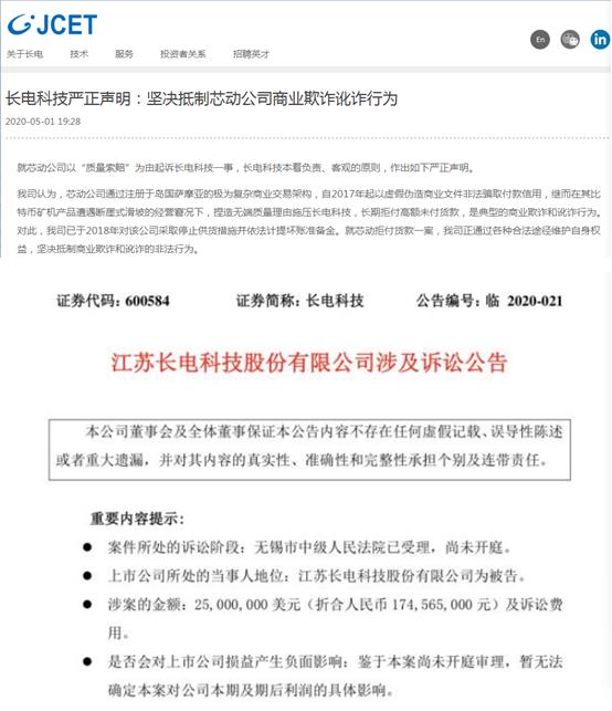 涉诉公告显示,长电科技于2020年4月30日收悉《应诉通知书》,芯动公司称长电科技向其提供的芯片封装质量不合格,造成芯片不能正常工作,给其造成来料成本损失达1415万美元,被公司暂扣的芯片及库存晶圆损失达1286万美元,损失共计2500万美元(按汇率中间价折合人民币1.74亿元),芯动公司据此向公司索偿。
