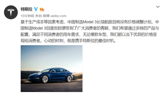 炣燃科技5月3日讯(江丞华) 5月2日,特斯拉通过其官方微博发文表示,基于生产成本等因素考虑,中国制造Model 3长续航版目前没有价格调整计划。