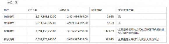 伴随着业务扩张,2019年京东方的期间费用整体占比下降,显示出良好的成本管理能力。其中销售费用、管理费用变动均明显小于营收增速;而财务费用更是同比减少37.62%,其在年报中表示“主要是报告期内公司偿还账面可换股的债权,财务费用降低”。
