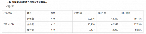 京东方在2019年年报中提及,“显示器件出货面积同比增长19%,出货数量同比增长16%,智能手机液晶显示屏、平板电脑显示屏、笔记本电脑显示屏、显示器显示屏、电视显示屏五大主流产品销量市占率继续稳居全球第一”。