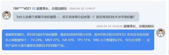 有分析认为京东方只是占据了日韩面板厂商战略性放弃的低端老旧市场,对此京东方总裁刘晓东近期也给出了具体回应,在多个品类中市场占有率全球第一,这些产品大部分都是应用新技术。