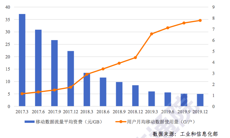 数据显示,在移动通信业务上,2019年第四季度,我国移动数据流量平均资费为5元/GB, 同比下降了41.2%,用户月均移动数据使用量为7.79GB,同比增长76.2%,移动通信月户均支出为46.8元,同比略降7.5%。