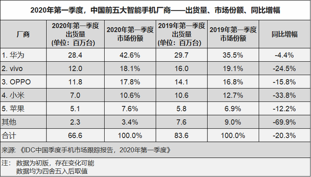 炣燃科技5月7日讯(锦江)5月6日,根据国际数据公司IDC手机季度跟踪报告数据,2020年第一季度,中国智能手机市场出货量约6,660万台,同比下降20.3%。