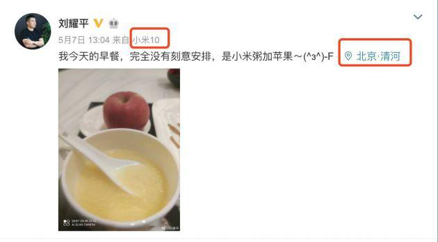 5月7日,刘耀平曾通过其个人微博发文称,早餐是小米粥加苹果。疑似暗示小米加刘耀平组合。此外,上述博文还显示,刘耀平发文时所用手机型号是小米10,定位为北京·清河。公开资料显示,小米科技园同样位于北京清河。