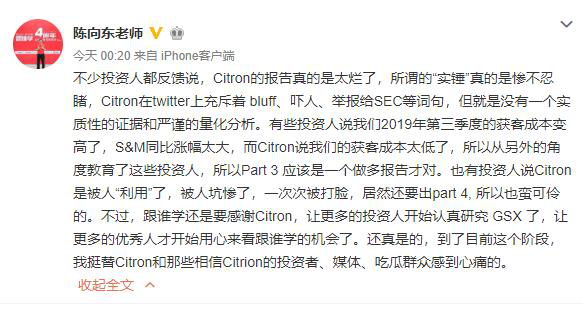 陈向东在文中表示,“有些投资人说我们2019年第三季度的获客成本变高了,S&M同比涨幅太大,而Citron说我们的获客成本太低了,所以从另外的角度教育了这些投资人,所以Part 3 应该是一个做多报告才对。”