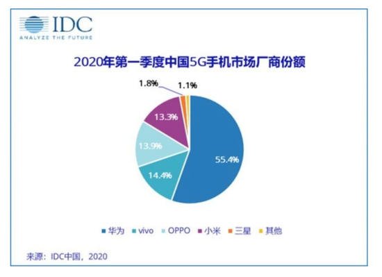 数据显示,今年第一季度,国内5G手机的出货量约1450万台,占整体市场21.8%,环比上季度增长64%。华为目前占有中国5G手机55.4%的市场份额,vivo、OPPO、小米、三星所占市场份额分别为14.4%、13.9%、13.3%、1.8%。