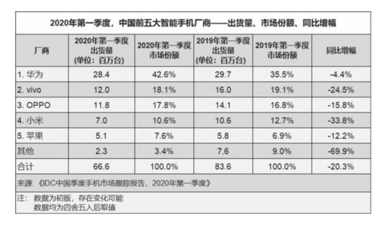 根据国际数据公司IDC发布的手机季度跟踪报告显示,2020年第一季度,中国智能手机市场出货量约6600万台,同比下滑20.3%。
