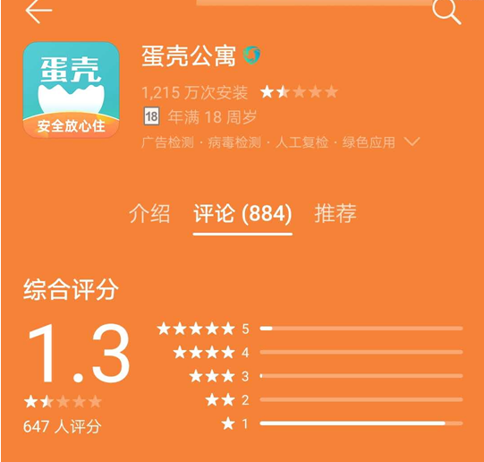 据安卓应用市场的蛋壳公寓页面显示,该APP综合评分为1.3分,总有647人评分,气候弄,绝大多数用户仅打了1分。用户评论的内容主要是描述蛋壳公司欺诈、骚扰和不合理收费等问题。