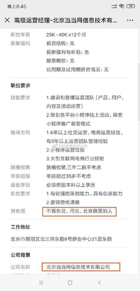 炣燃科技5月11日讯(锦江) 近日,一份当当网的“高级运营经理”招聘要求在网络引发议论。该职位要求“年龄超过35岁不考虑”、“不看东北、河北、北京籍贯的人”。