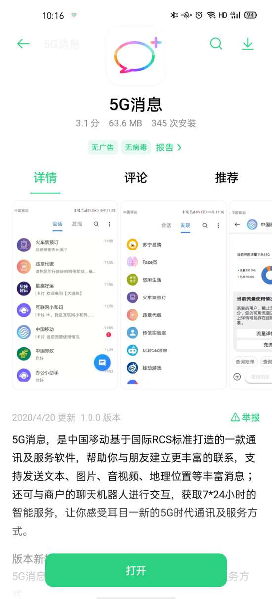 在该APP介绍中,“5G消息”App是中国移动基于国际RCS标准,打造的一款通讯及服务软件,支持发送文本、图片、音视频、地理位置等消息;还可与商户的聊天机器人进行交互,获取7*24小时的智能服务。