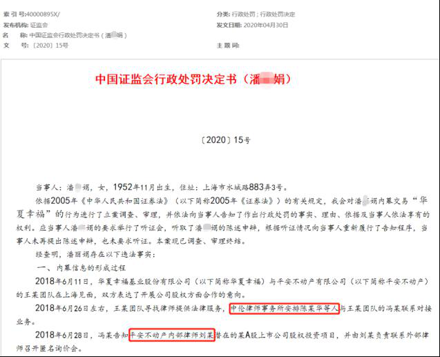 5月6日,中国证监会同时公告了两份行政处罚决定书,分别对潘某娟和张某非内幕交易华夏幸福基业股份有限公司(以下简称“华夏幸福”)股票进行处罚。尤其引人注意的是,这两人各自的亲属刘某和陈某华,均为2018年平安137亿收购华夏幸福股份交易中的内幕信息知情人,其各自身份分别是交易中平安方面的内部律师和外聘律师。