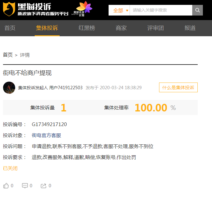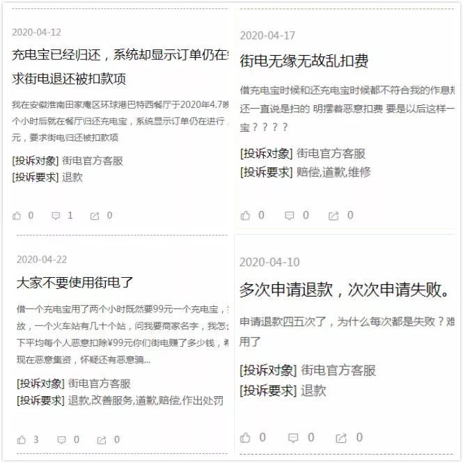 在互联网各个投诉平台上,都有合作商家反映街电不给商家提现的问题,有商家已经发起集体投诉。