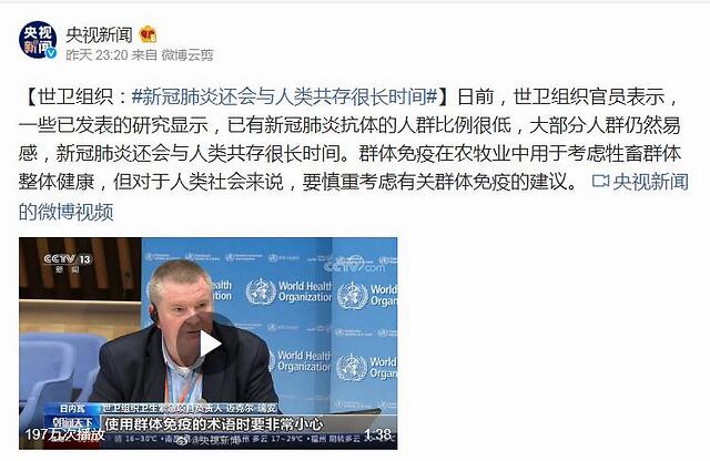 商业 世卫组织:已有新冠肺炎抗体的人群比例很低,大部分人群仍易感 2020-05-13 10:17:58 分享 来源:环球网日前,世卫组织官员表示,一些已发表的研究显示,已有新冠肺炎抗体的人群比例很低,大部分人群仍然易感,新冠肺炎还会与人类共存很长时间。群体免疫在农牧业中用于考虑牲畜群体整体健康,但对于人类社会来说,要慎重考虑有关群体免疫的建议。(原标题:世卫组织:新冠肺炎还会与人类共存很长时间)