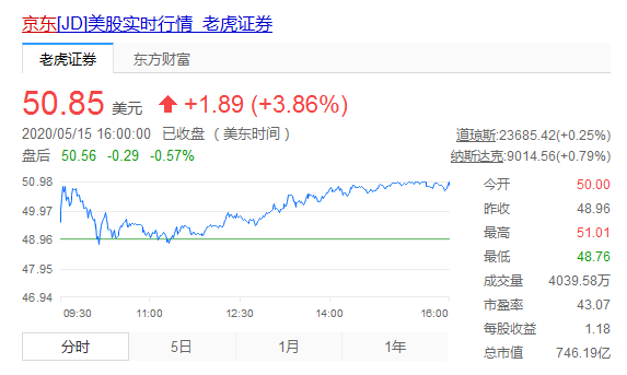 截止美国当地时间15日收盘时,京东股价为50.85美元,其总市值为746.19亿美元。