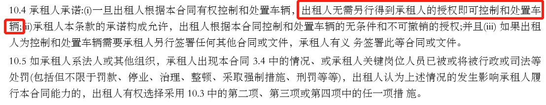 对于弹个车这种“不打招呼”直接收车的行为,大叔在《车辆融资租赁合同(售后回租)》中发现也是“早有预谋”:一旦出租人根据本合同有权控制和处置车辆,出租人无需另行得到承租人的授权即可控制和处置车辆。