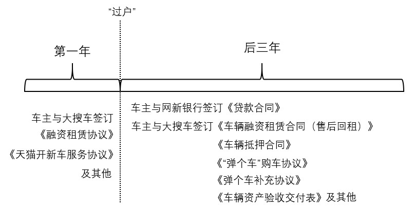 大搜车使用车主的个人信息向网商银行申请个人贷款,审核通过后车主与网商银行签订《贷款合同》,并与其形成借贷关系,同时还与大搜车签订了《车辆融资租赁合同(售后回租)》、《车辆抵押合同》、《“弹个车”购车协议》、《车辆资产验收交付表》等,通过让人眼花缭乱的合同条款及晦涩难懂的法学概念,在车辆所有权问题上大做文章……