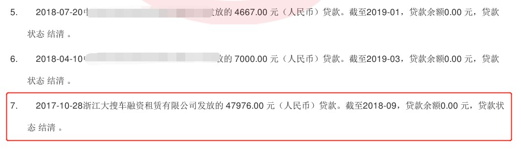 赵先生2020年2月25日在百行征信查询个人信用报告,在“从未逾期过的非循环贷款账户明细”项下,发现有一笔2017年10月28日(赵先生的“购”车时间为2017年8月21日)浙江大搜车融资租赁有限公司发放的贷款记录,金额正好等于赵先生在弹个车为期一年的租金总额。