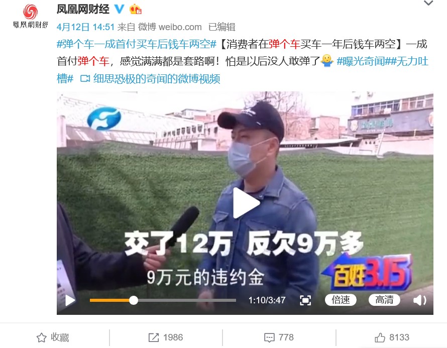 炣燃科技5月18日综合凤凰网财经报道 前段时间,微博话题“弹个车一成首付买车后钱车两空”引发众多讨论,视频中张先生表示自己2018年3月在弹个车APP买了一辆车,第一年共付了11万多元后,被告知不允许再分期,必须把车款一次性付清。