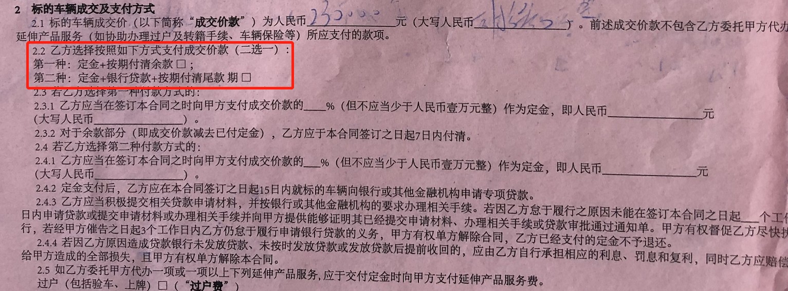 梁先生(化名)2018年在弹个车“购买”了一辆2012款奥迪A6二手车,但是他告诉大叔,在整个“购车”过程中都没有工作人员和他提及或讲解任何与“融资租赁”相关的内容。更过分的是,大叔发现这份纸质版的《二手车销售合同》中,通篇都没有提到“融资租赁”、“租车”等相关内容,甚至在“选择支付成交价款方式”这样的关键条款,合同上给出的文字描述也非常模糊,都是“定金+按期付清余款”、“定金+银行贷款+按期付清尾款”,完美规避了“租金”、“月租”等租赁词汇。