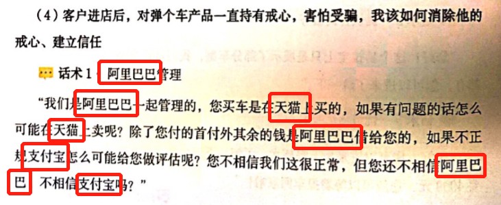 下图是《弹个车员工成长手册》教给销售人员消除用户戒心的话术,可以看到几乎每句话都离不开阿里巴巴、支付宝: