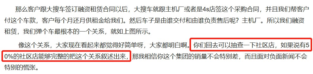 大搜车(弹个车母公司)旗下的搜车大学2020年4月发表的《认知融资租赁 走向转型复苏》提到,“你们回去可以抽查一下社区店,如果说有50%的社区店能够完整的把这个关系(融资租赁)叙述出来,那我相信你这个集团的销量不会特别差”,说明即便是弹个车“买车变租车”已经被推上风口浪尖的现在,仍然有很多员工对弹个车的业务模式并不十分清楚