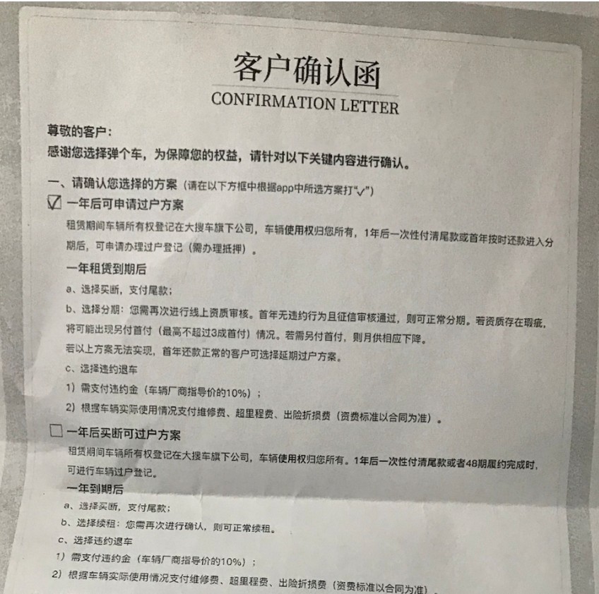 下图是大搜车《客户确认函》列出的“一年后可申请过户方案”和“一年后买断可过户方案”分别对应的具体操作: