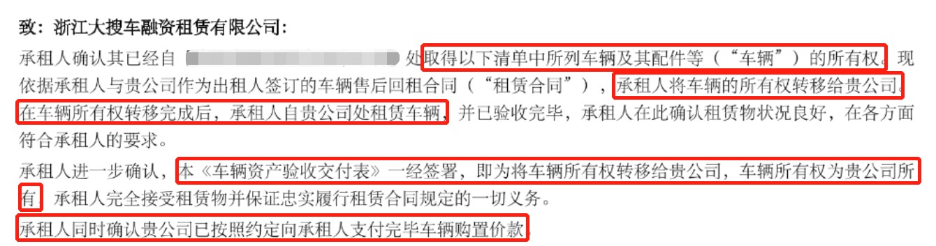 更为离奇的是,关于过户,在名为《车辆资产验收交付表》的协议中,大叔发现了“致:浙江大搜车融资租赁有限公司”,表述的内容竟然是承租人将刚刚转移给自己的车辆所有权,又转移给了大搜车!而且还确认大搜车已经向承租人支付完毕了车辆的购置价款!