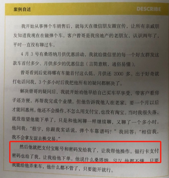 大叔在《弹个车员工成长手册》中,发现了一个破首单案例,讲的是销售人员通过打感情牌获得订单后,直接用身处外地的客户发给ta的支付宝账号和密码“帮助”用户完成了订单。令人诧异的是,这一系列操作,弹个车不仅没有指明员工操作的不规范,反而将其作为经典案例放入《弹个车员工成长手册》供销售人员学习。