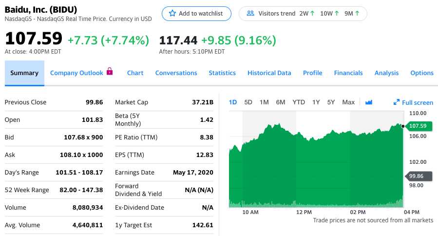 雅虎财经汇总的数据显示,百度第一季度营收和调整后每股摊薄收益超出市场一致预期,推动股价在盘后交易中上涨逾9%。