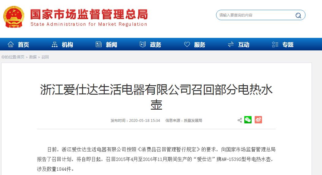 炣燃科技5月19日讯 (宏斌)据国家市场监管总局网站消息,日前,浙江爱仕达生活电器有限公司按照《消费品召回管理暂行规定》的要求,向国家市场监督管理总局报告了召回计划,将自即日起,召回2015年4月至2016年11月期间生产的“爱仕达”牌AW-1539S型号电热水壶,涉及数量1844件。