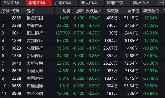 商业 港股金融板块走低!中银香港跌近5%,友邦保险跌逾4% 2020-05-22 10:20:19 分享 新浪港股讯 5月22日消息,金融股走低,尤其香港本地金融股跌幅居前。易鑫集团跌超6%,中银香港跌近5%,恒生银行跌逾4%,友邦保险跌超4%,东亚银行跌超4%。中国人寿、海通国际、中金公司等跌超3%。