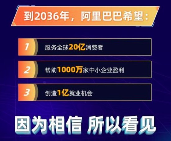 阿里还为自己定下了2036年实现服务20亿消费者、帮助1000万中小企业实现盈利、创造1亿就业机会的目标。