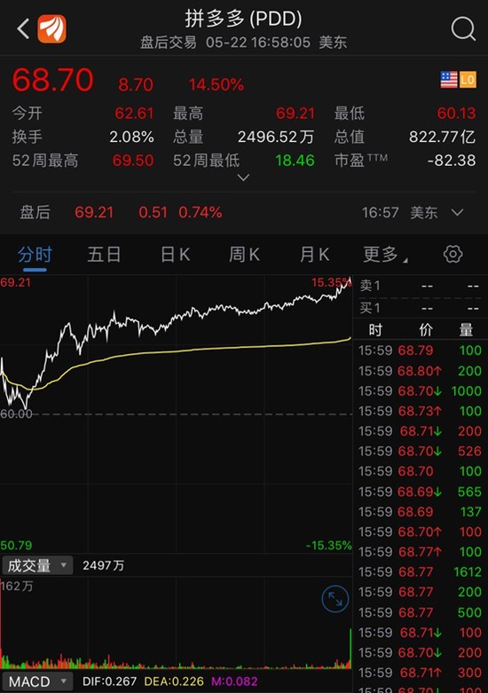 而拼多多在中概股齐跌之时一度逆势上涨15.35%,收涨14.5%,市值暴涨百亿美金,目前拼多多的市值已突破800亿美金,两月内股价已经翻倍。