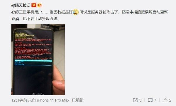 科创 传三星服务器遭攻击!黑屏、大面积重启,消费者惊叹:三星炸了吗 2020-05-23 08:36:08 分享 炣燃科技5月23日综合IT之家消息 据IT之家网友反馈,5月23日凌晨大量三星手机用户微博发文称自己的三星设备遭遇黑屏和大面积重启问题。此次受影响手机用户包括S8、S9、S10乃至于S20等机型。有网友推断三星手机应该是遇到时间bug/服务器崩溃,解决方法:1.关闭自动更新(关闭“通过 WLAN 自动下载”)。2.备份手机资料。3.重启时进桌面将时间改为5月1日。目前三星官方尚未就此次事件作出回应。