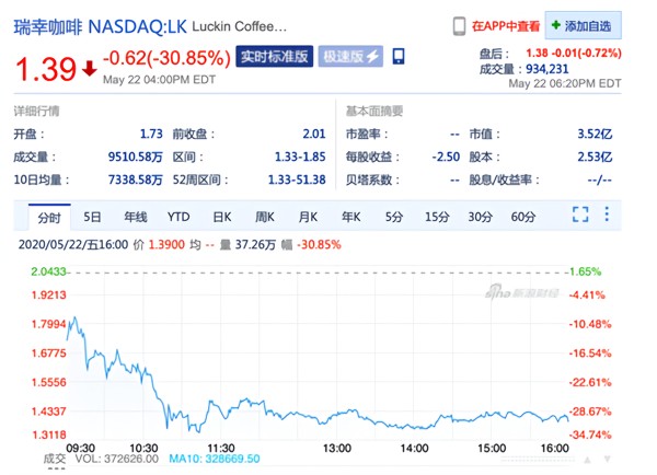 炣燃科技5月23日综合凤凰网科技消息,瑞幸咖啡复盘第三日,收盘股价再度大跌30.85%,复牌后连跌三日,累计下跌68.34%。周五收盘,瑞幸咖啡收报1.39美元,总市值仅为3.5亿美元。