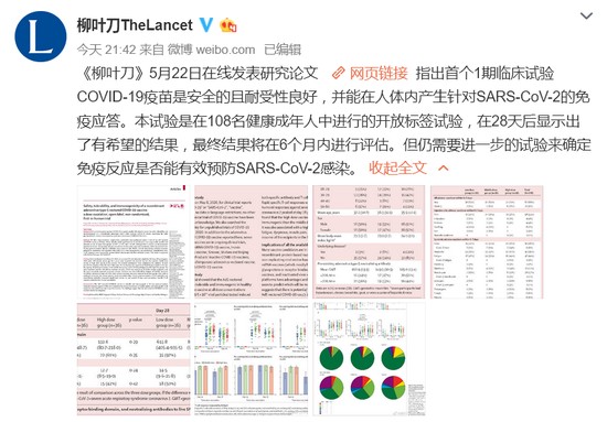 《柳叶刀》也通过其官方微博称:首个1期临床试验COVID-19疫苗是安全的且耐受性良好,并能在人体内产生针对SARS-CoV-2的免疫应答。本试验是在108名健康成年人中进行的开放标签试验,在28天后显示出了有希望的结果,最终结果将在6个月内进行评估。但仍需要进一步的试验来确定免疫反应是否能有效预防SARS-CoV-2感染。