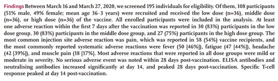 论文称,在108名(低剂量组、中剂量组和高剂量组各36人)受试志愿者中,有30名低剂量组、30名中剂量组和27名高剂量组成员报告了在接种后7天内出现至少一种不良反应。最常见的不良反应是发烧、疲劳、头痛和肌肉疼痛等。在所有不良反应报告中,大多数报告都是不良反应为轻度或中度的,并且在接种后28天内没有出现严重不良反应的报告。