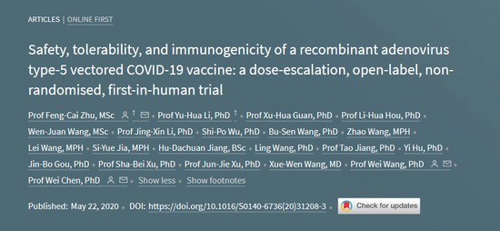 (观察者网讯)北京时间5月22日晚21时许,国际学术期刊《柳叶刀》(The Lancet)在线发表全球首个重组腺病毒5型载体新冠疫苗I期临床试验结果,该论文的通讯作者是中国工程院院士陈薇。