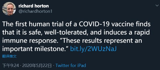 同一时间,《柳叶刀》主编理查德·霍顿通过社交媒体分享了这则消息,并赞叹:首次对此新冠病毒疫苗的人体实验结果发现,它具有良好的安全性和耐受性,并且能够诱导快速的免疫反应。“这些结果代表着一个重要的里程碑。”