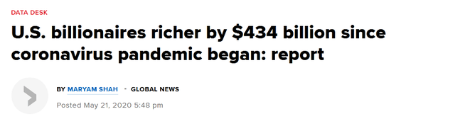 炣燃科技5月23日综合每经新闻消息 据环球网援引加拿大“环球新闻”21日报道,在美国实施疫情封锁的两个月里,美国亿万富翁们的财富增加约4340亿美元(30873.9亿人民币),增幅近15%。