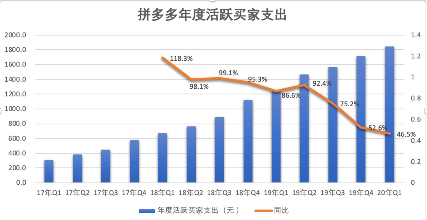 拼多多本季度的平均每月活跃用户为4.874亿,比上一季度增长68%。2019年同一季度为2.897亿。到2020年3月,年度活跃买家为6.281亿,相比去年同期4.433亿美元增长了42%,每个活跃买家的年度支出为1842.4元。